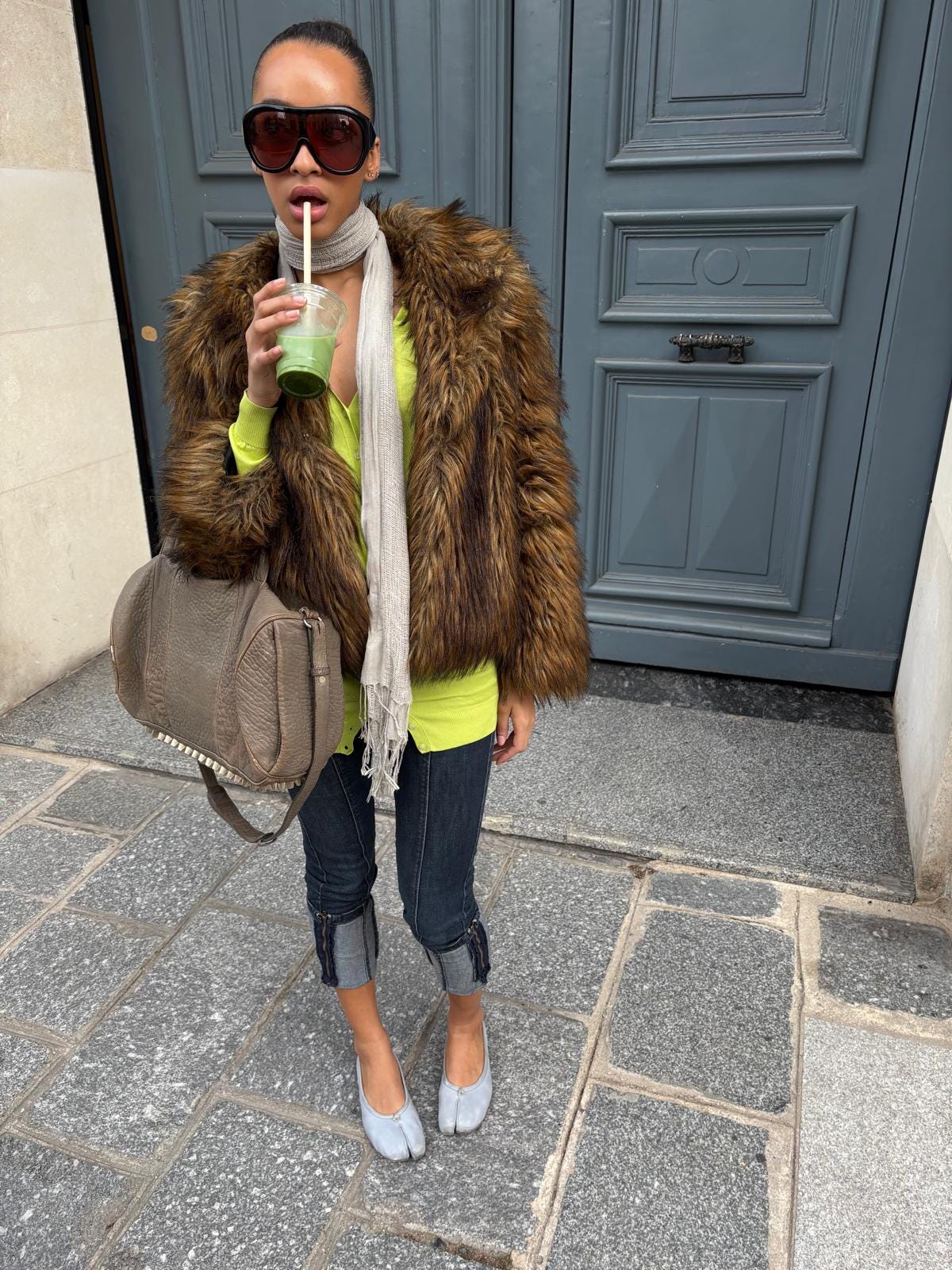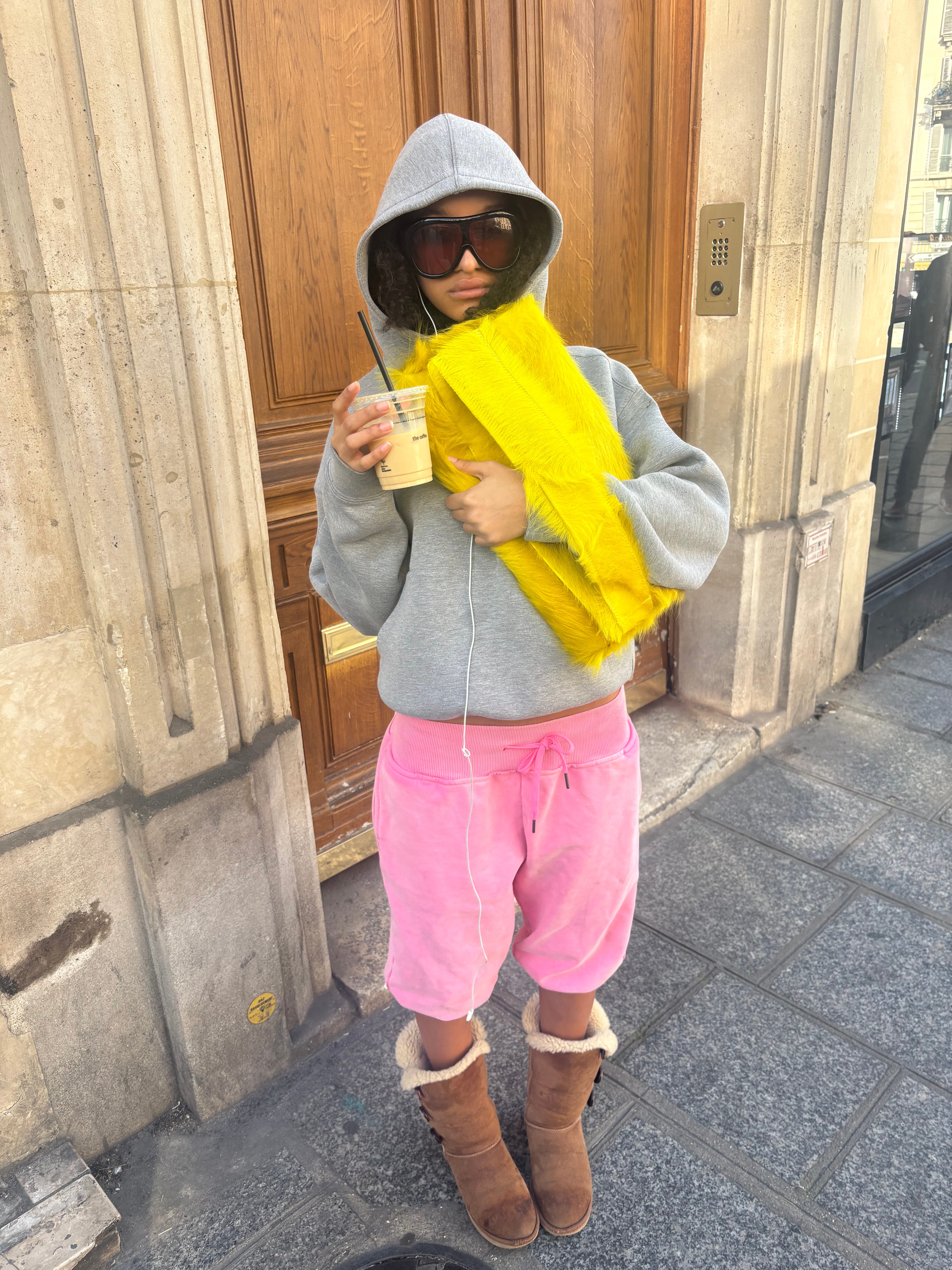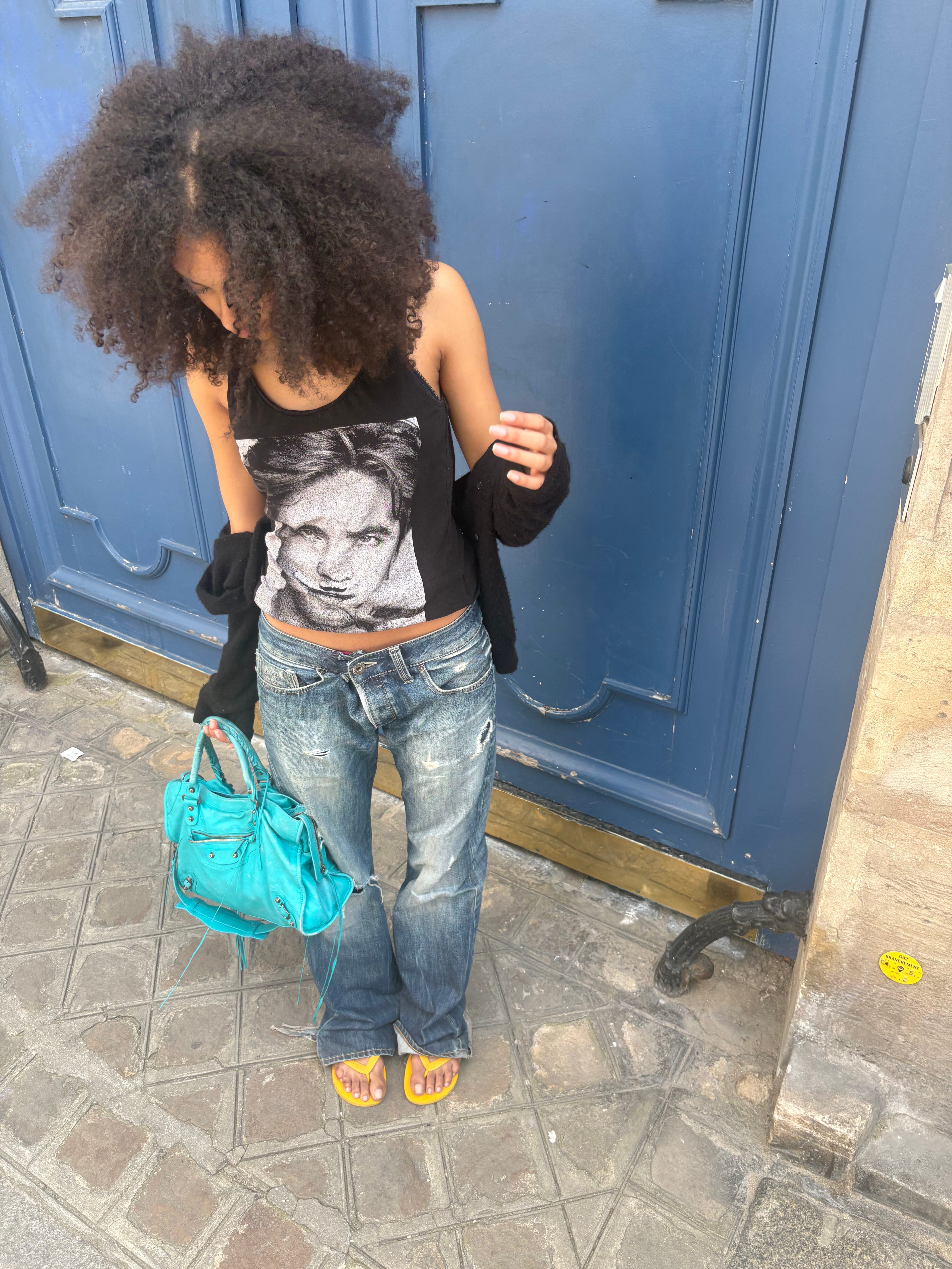 Right now, I’m loving everything very low-waisted: jeans, sweatpants, and skirts. Speaking of skirts, I adore tulle tutu-style skirts—perhaps worn with studded heels and dressed down with a graphic baby tee. Another combo I love is ripped jeans and colorful flip flops, yellow or pink! I recently bought a Dolce & Gabbana cardigan, it’s ridiculously long and in this outrageously bright yellow-green. And of course, I never go anywhere without my teal Balenciaga city bag.